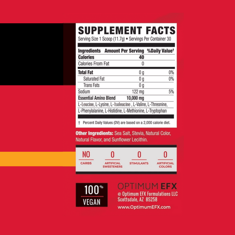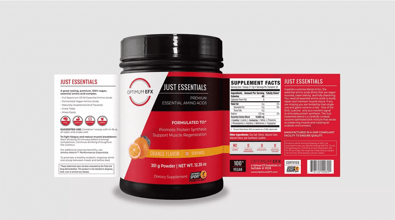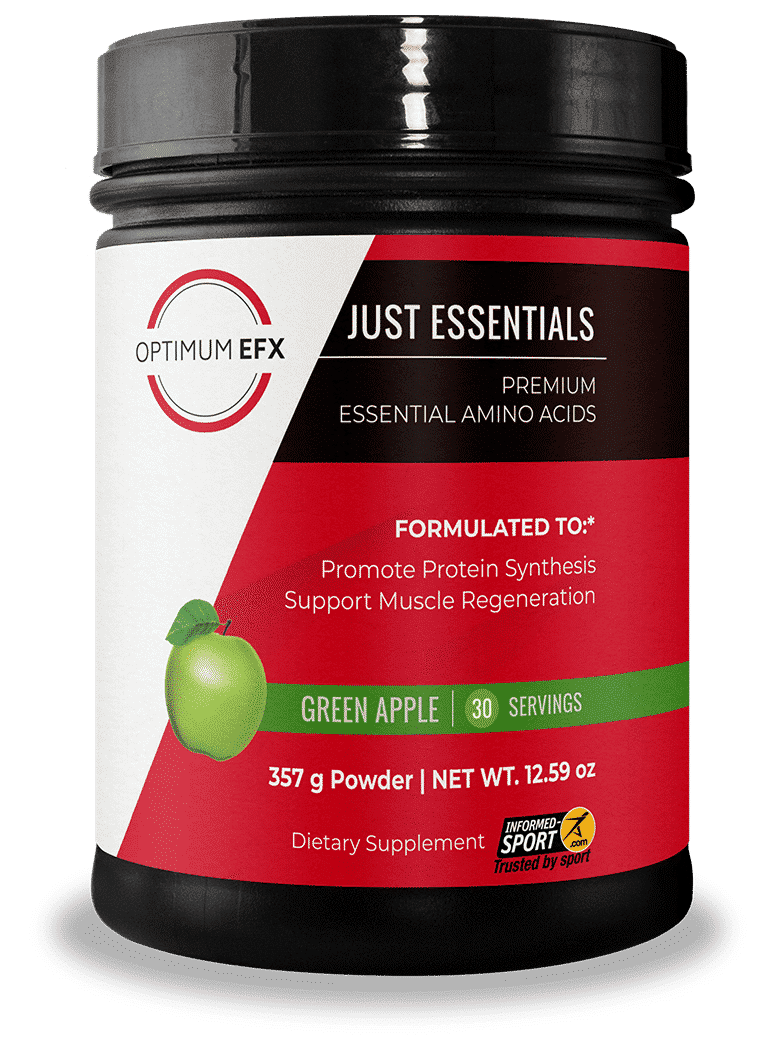 Just Essentials by Optimum EFX does that by supplying a precise blend of ALL of the EAAs, which are vegan sourced, clean tasting, and fully dissolving. It’s a carefully curated, leucine-optimized EAA mixture that excels at preserving muscle and creating an anabolic environment.